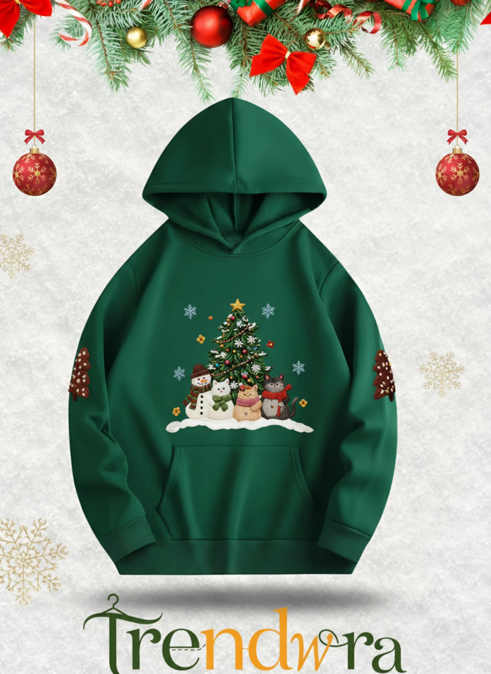 Crafted from soft and warm fabric, it ensures comfort during cold weather. The relaxed unisex fit suits everyone, while the hood and front pocket add practicality and style. Perfect for everyday wear, winter outfits, or as a charming Christmas gift.