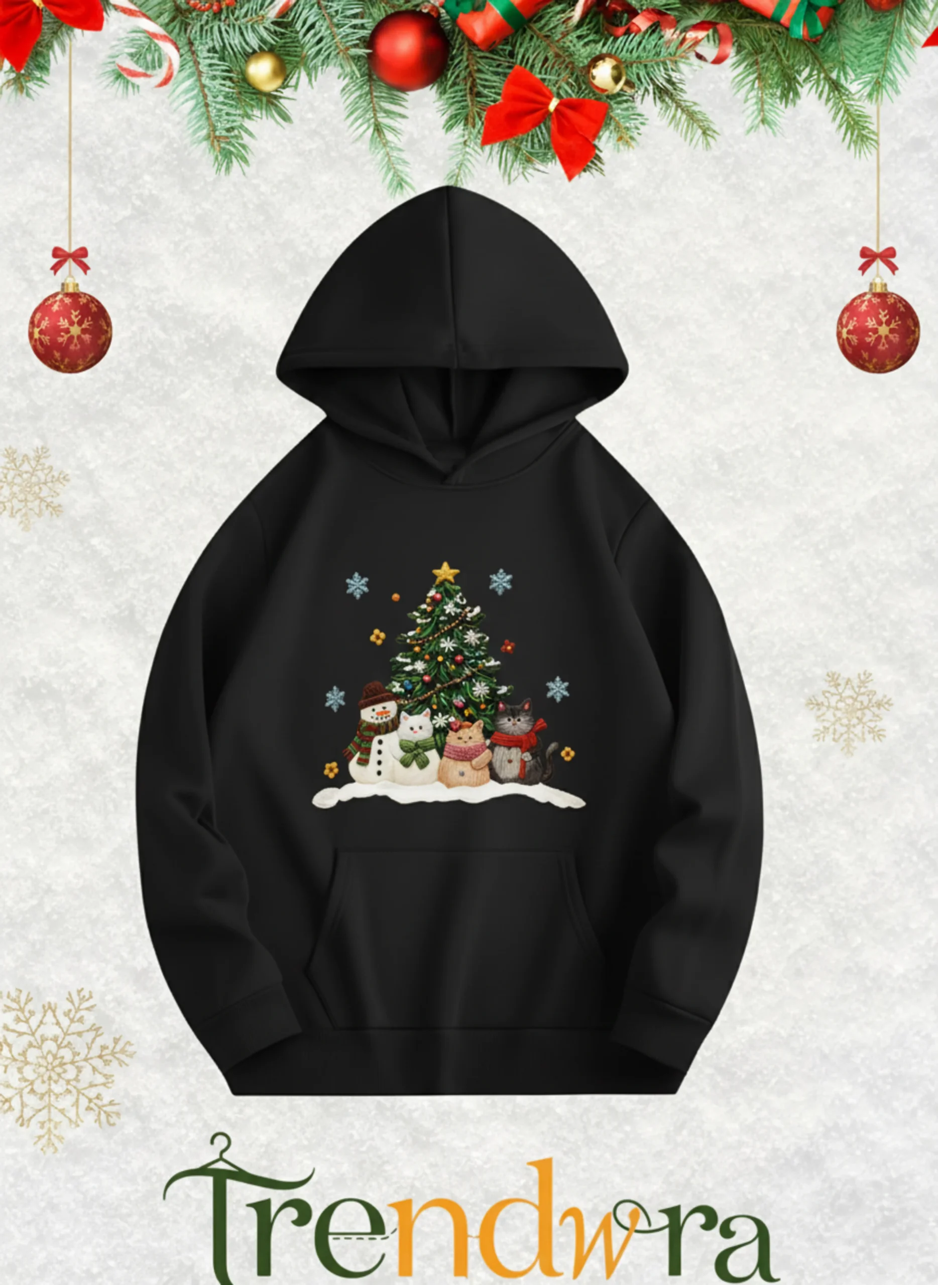 This unisex Christmas hoodie features a festive Christmas tree design with cute characters, creating a warm and cheerful winter look.